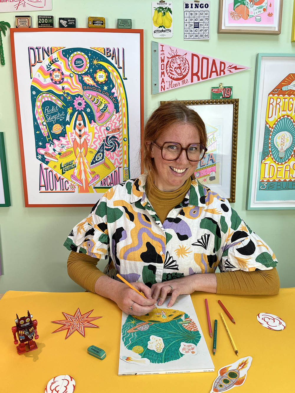 Inspired by mid-century ephemera, vintage typography, and bold colour combinations, Jacqueline’s work often takes the form of detailed, explorable scenes - like her illustrated take on pop culture in New York City. Her designs invite viewers to slow down and take a closer look.