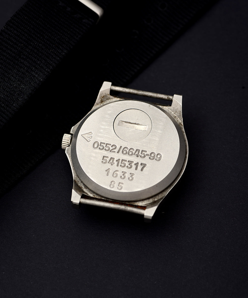 The case backs of military watches are engraved with the stores reference, which tells us a lot about the individual watch. This particular watch has an engraving which reads 0552/6645-99, to break this down: 0552 refers to an item issued to the Royal Navy, 6645 is the code for a “Time Measuring Instrument” and 99 is the country identifier for the UK. The number below, 1633 is the serial number of the individual watch. The two digits at the end of the engraving is the year of issue, so 1985 in this case.