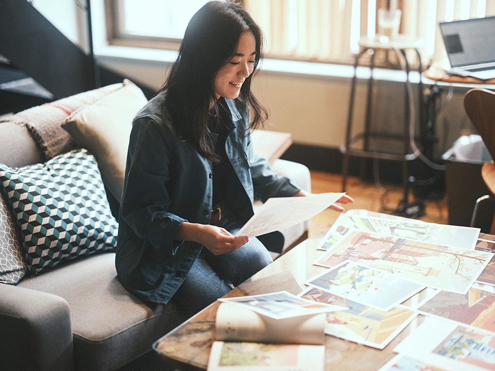 Drawing from the world around her, she loves to experiment with spatiality, storytelling, and bold colours.