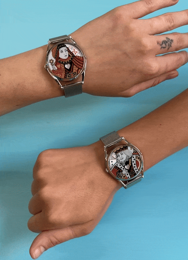 Based on the classic playing card characters of the King and Queen of Hearts.