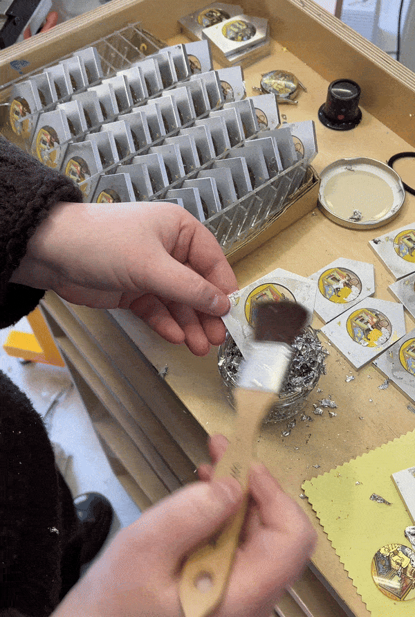 The three metallic robots, engrossed in the action of the pinball machine were each gilded by hand in a different metallic foil palladium, 20ct. citron gold and 22ct. rose gold).