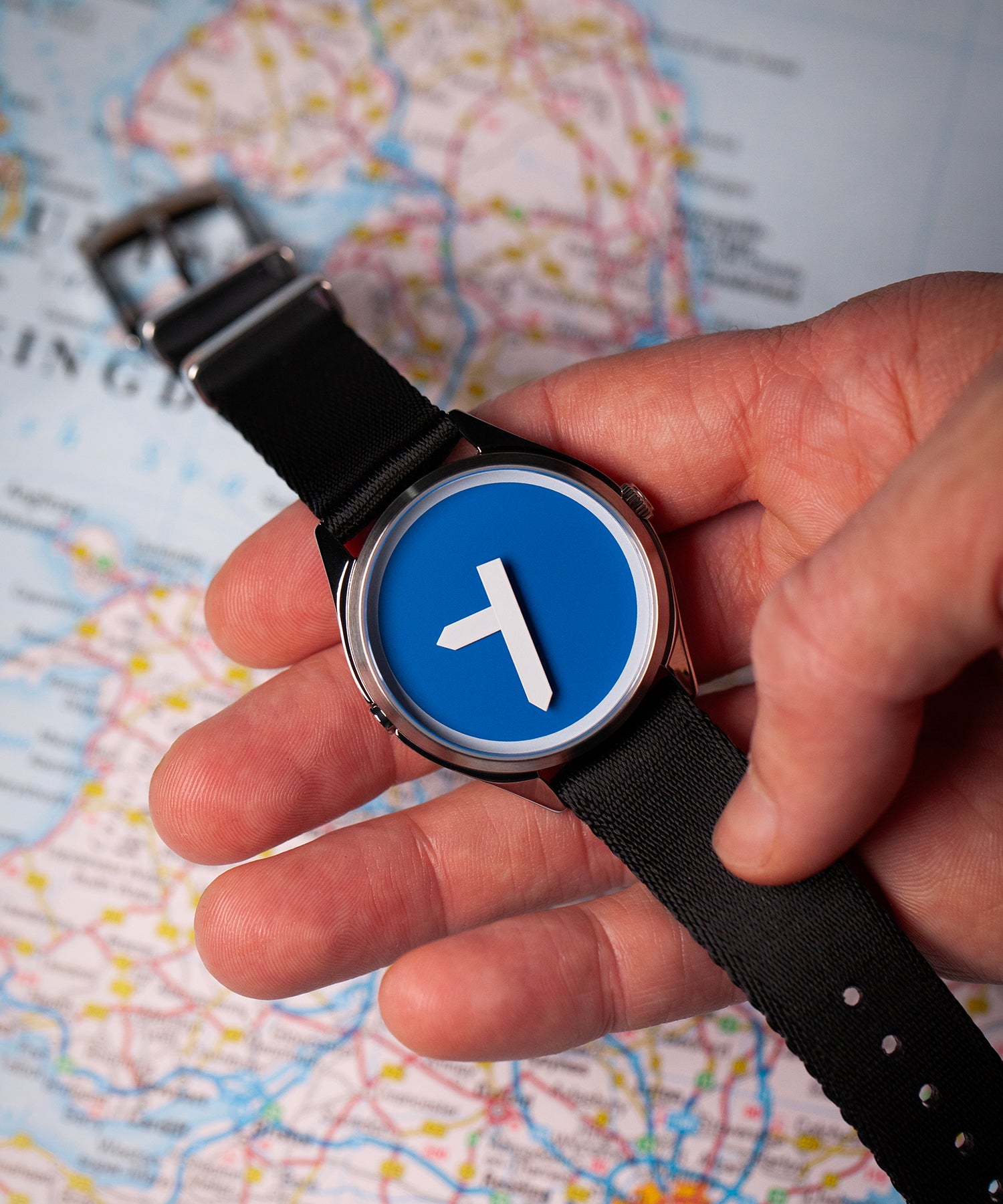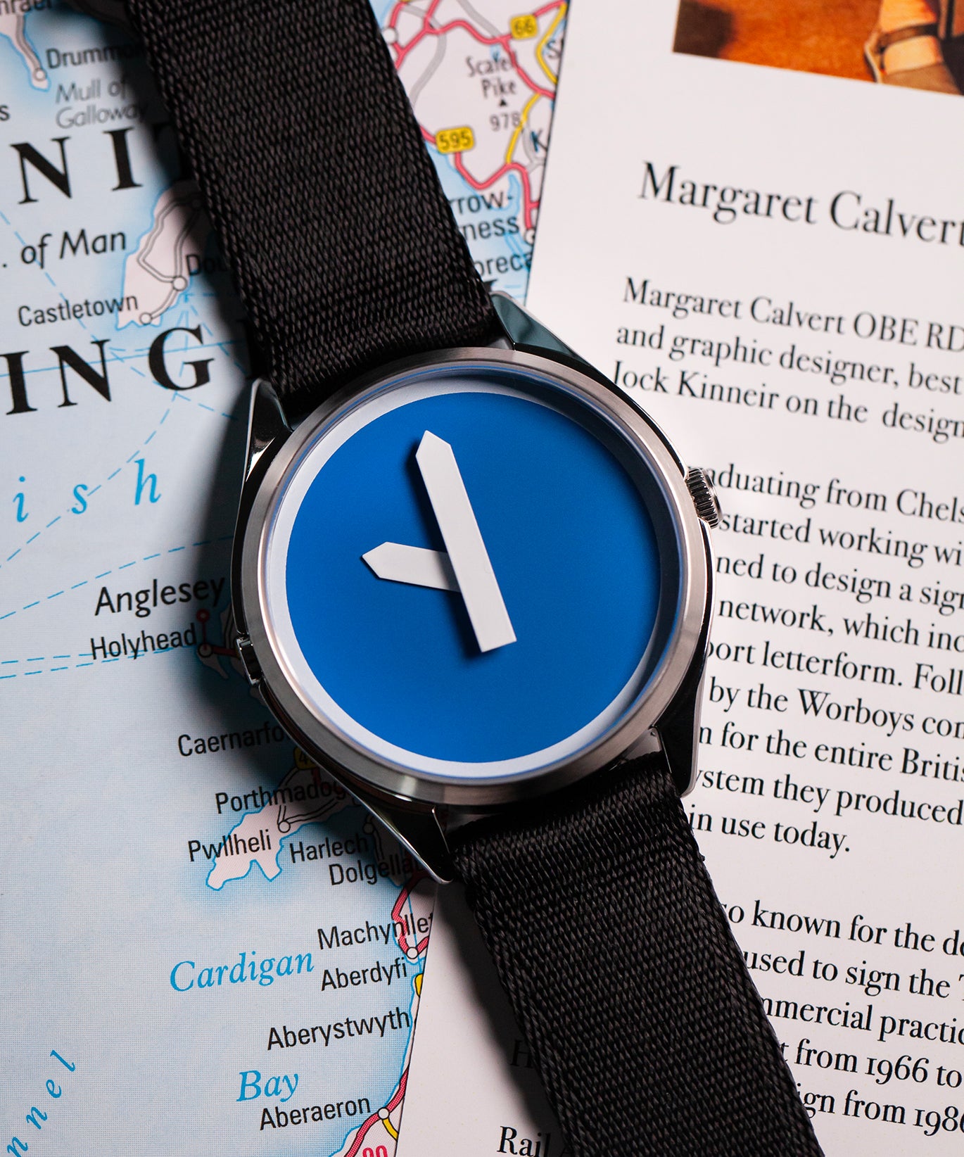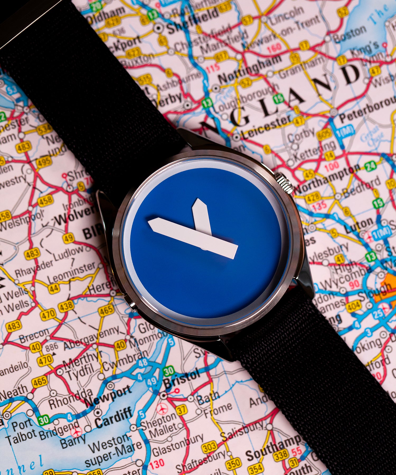 The hands of the watch are inspired by the white navigational arrows from the motorway sign and the strap is cleverly made from seat belt fabric - a nod to the drivers the signs were originally designed for.