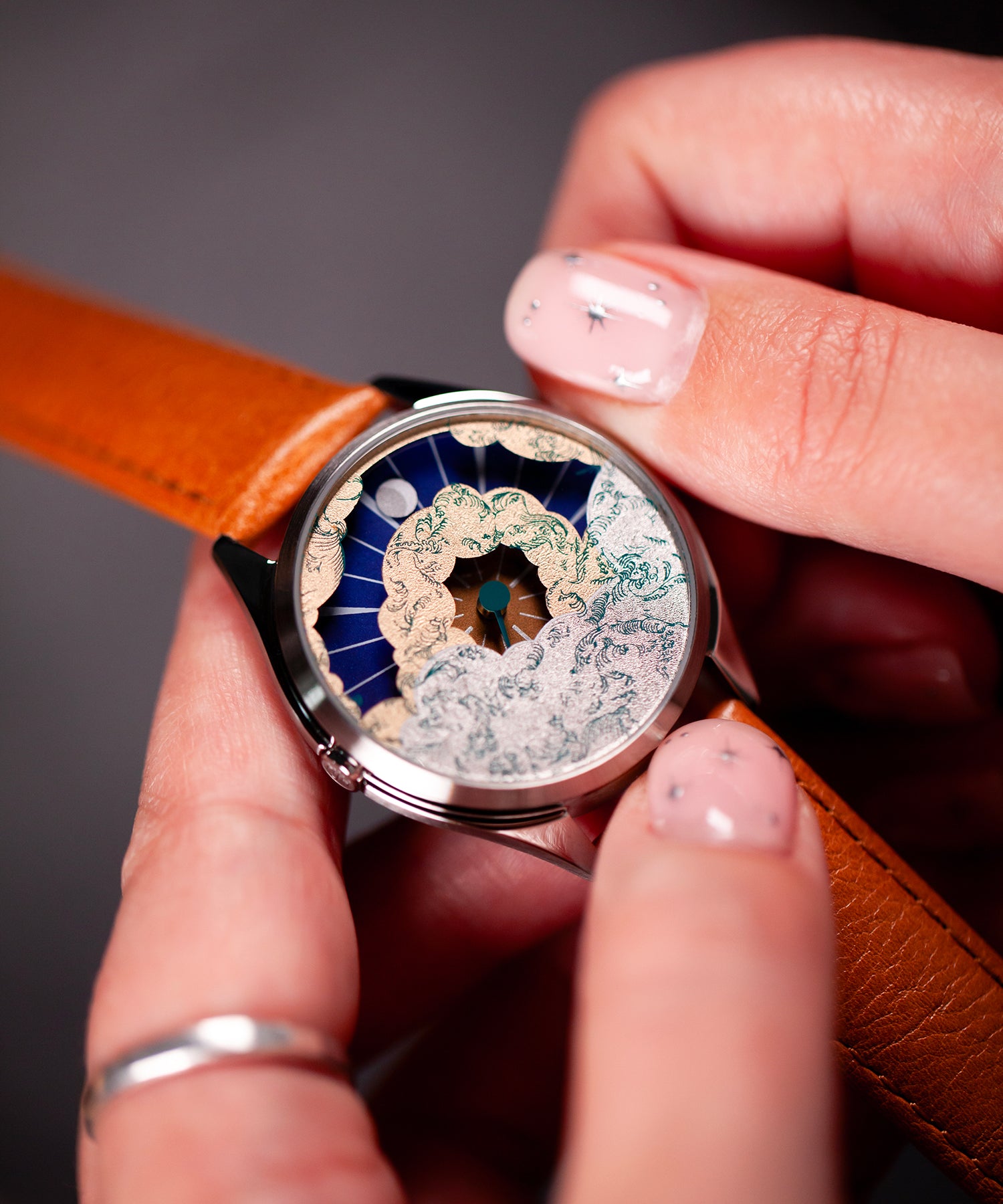 This design is part of a set of four watches which Marion has produced, each of which embody a different element. In this series, Nuage is the element of air.