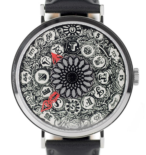 The watch design is a mix of Victorian lettering, old school tattoos and the world of the circus.
