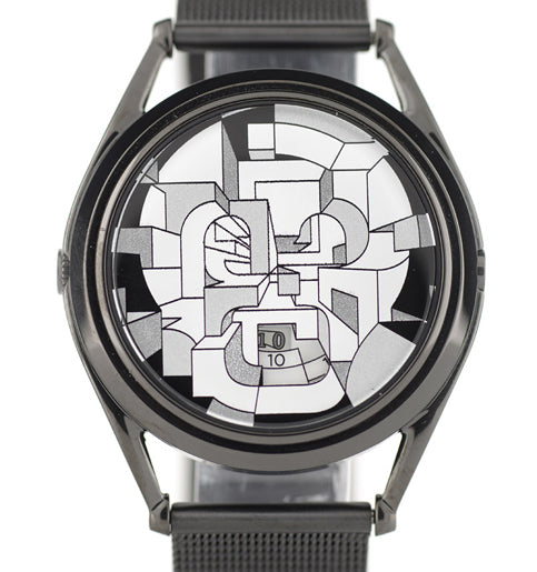 Edward Monaghan re-worked our skull designs to create Vanishing Point. The abstract effect is increased by the mixture of mirror and metallic inks, which are only visible when light catches the watch face.