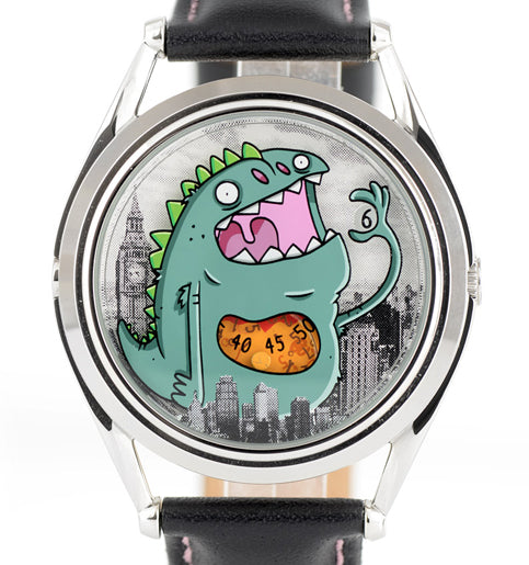 This watch was designed by Onorio D’Epiro. The monster has the hour in his hand and the minutes in his stomach.