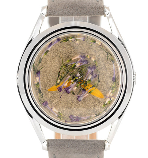 This watch has a display of real dried flower petals, gilded above a shimmering 22 carat gold leaf dial.