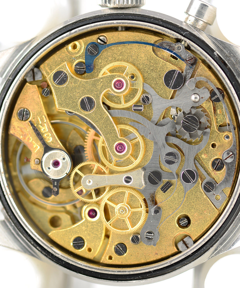 This is a Royal Navy issued single-button Lemania chronograph, these watches were first ordered by the Navy for pilots and navigators in the late 1940s and Lemania continued supplying them until the early 1960s. The watch evolved over the years, but this watch is part of the first style. There was a later modification to the case back and also a further change to the case, these are referred to as Series I, II and III, this is a Series I